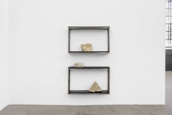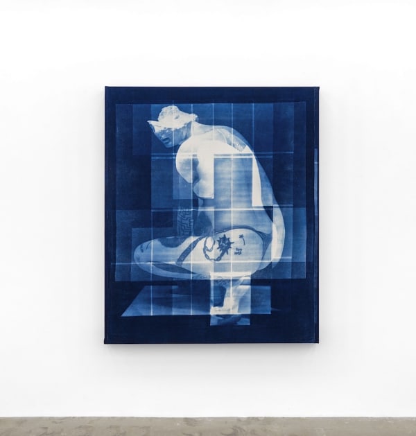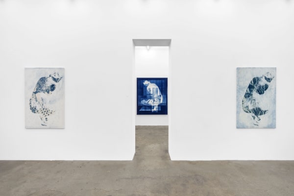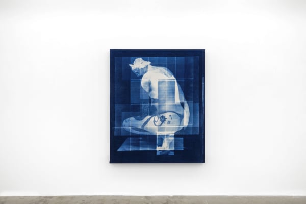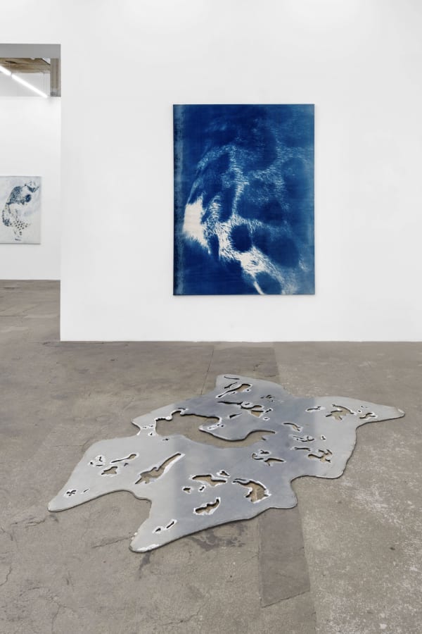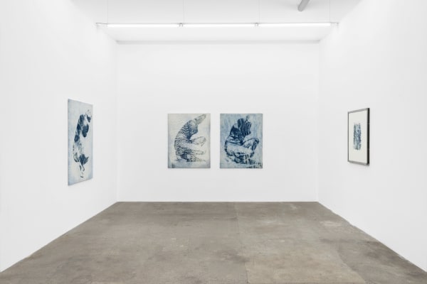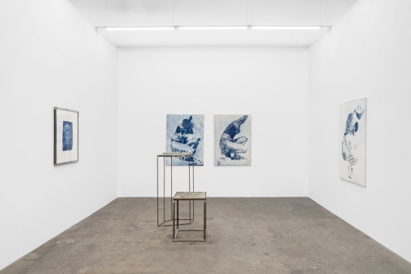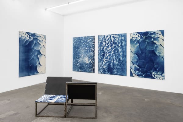 While Klara Meinhardt's previous gallery exhibition in 2022 focused thematically on identity-forming environments, in CONCEPT ROOM the artist now brings together and continues various strands from her work in terms of form, technique and content. Once more there is a focus on people's relationship to their own bodies, and the diverse cultural practices and techniques involved in shaping and improving the human body. The largest room of her most recent exhibition, however, focuses on another relationship: that between animals and humans. Cyanotypes, which take up the patterns of animal fur, scales and skin, adorn the walls of the room. The two heavy steel chairs invite visitors to take a seat and look at the prints and sculptural objects, which are presented like hunting trophies.