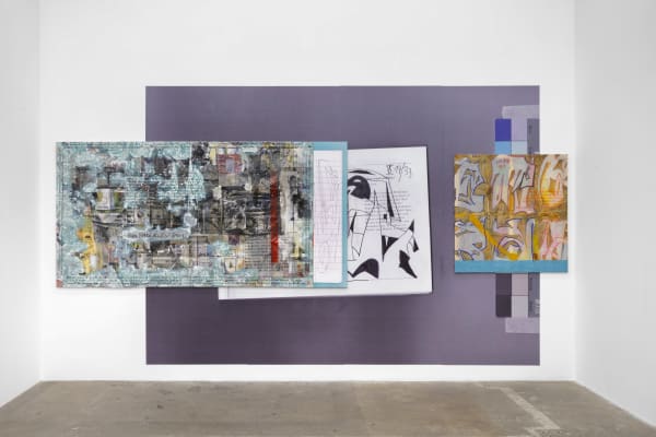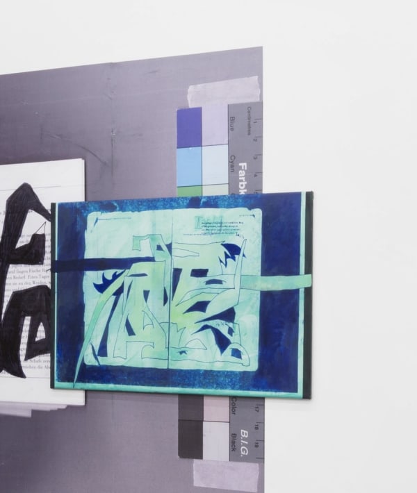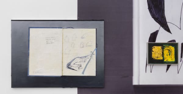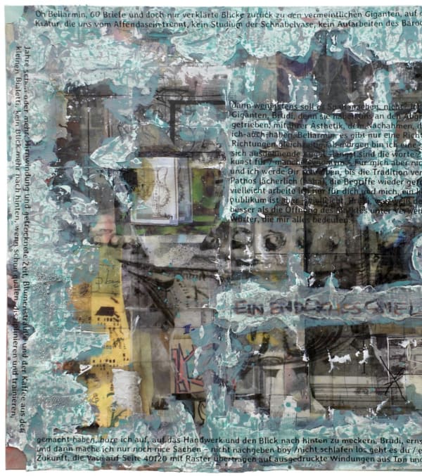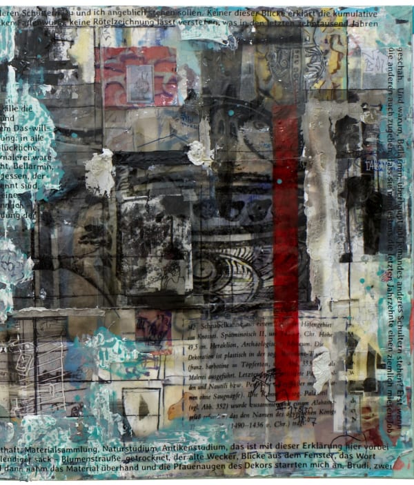 Skizzen auf Kalenderblättern und in Notizbüchern. Sie werden digitalisiert, mit verschiedenen Druckverfahren vergrößert und auf Leinwände übertragen. Scannen, Vergrößern, Nachbearbeiten sind analytische Vorgänge. Immer wieder legen sich Epoxid- und Acrylschichten über Kopien. Teile werden dazugenäht, weggenommen, ausgeschnitten. Die collagierten und mit Epoxidharz überzogene Erinnerungslagen transferieren das digitale Quellmaterial ins Objekthafte. Es folgen kurze malerische Gesten, die auf der digital reproduzierten Fläche eher als Störungen und Unsicherheitsmomente in Erscheinung treten, oft ergänzt um Tagebucheinträge und lyrische Versatzstücke. Sprache und Typografie kehren als Texte in die Bilder zurück, aus deren grafischen Elementen sie zuvor entfernt wurden.